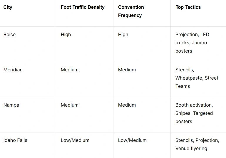 Cutting through in the Gem State means focusing activity where it counts. Guerrilla marketing at conventions in Idaho works best when tailored to the local pulse of each city—maximizing reach, relevance, and return. Here are the four most populated cities in Idaho, each with its unique convention culture and event marketing quirks: