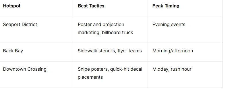 Imagine targeting signature locations like the Boston Convention & Exhibition Center, the Hynes Convention Center, and popular nightlife zones in the Back Bay and Seaport. Wheatpastings, sidewalk decals, and LED trucks weave visibility throughout:
